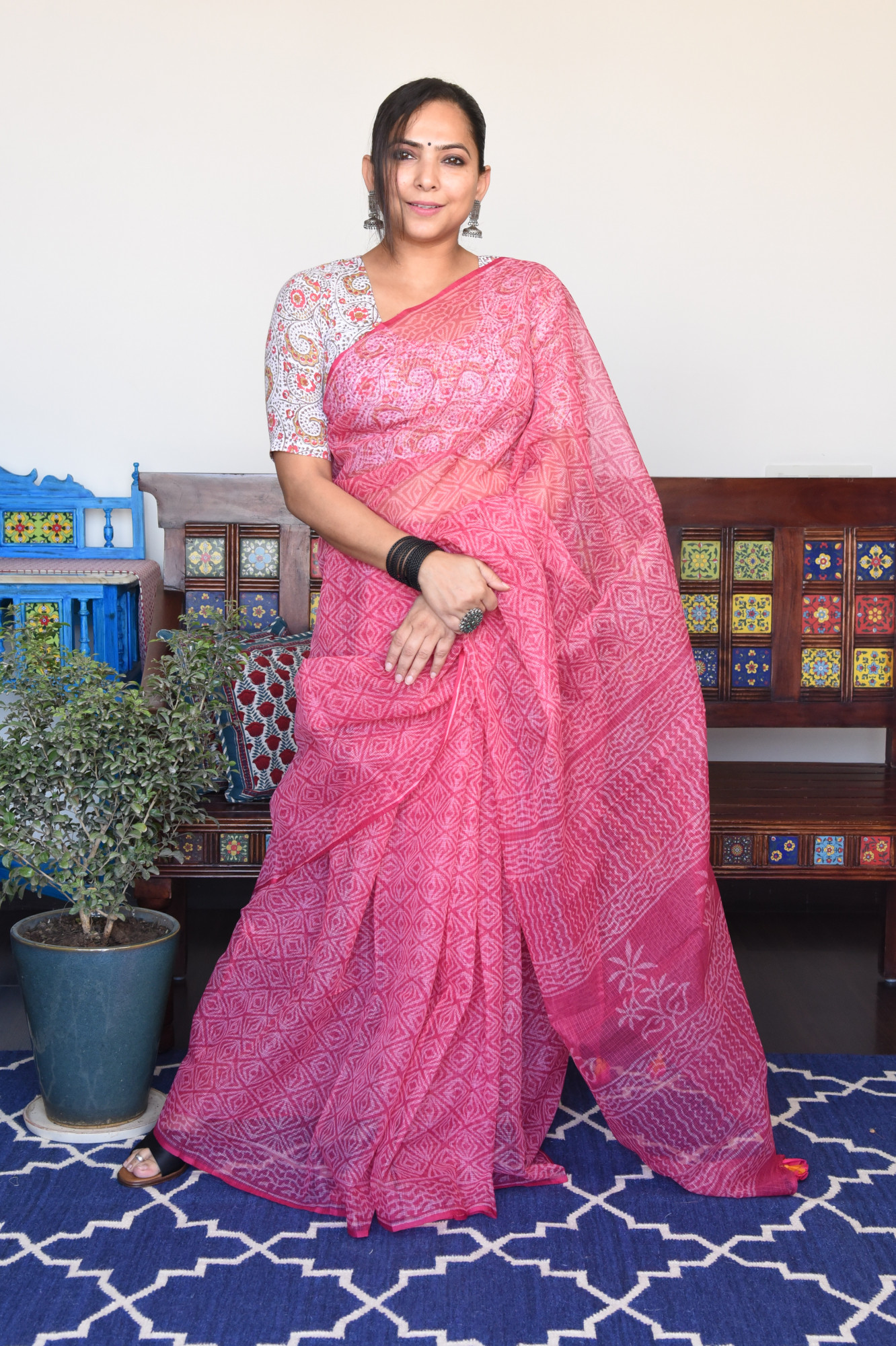 Handblock printed candy pink kota doria cotton saree. Accessorised with fabric tassels.