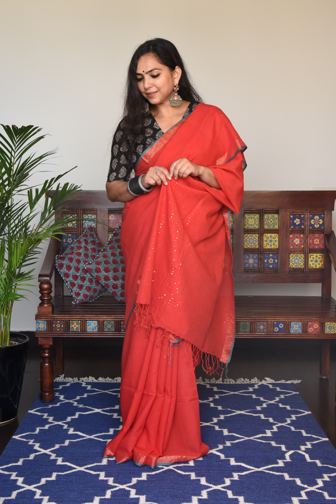 Handwoven bright re with golden zari border - blue selvedges cotton saree with woven sequins heavily on palla. Accessorised with tassles.