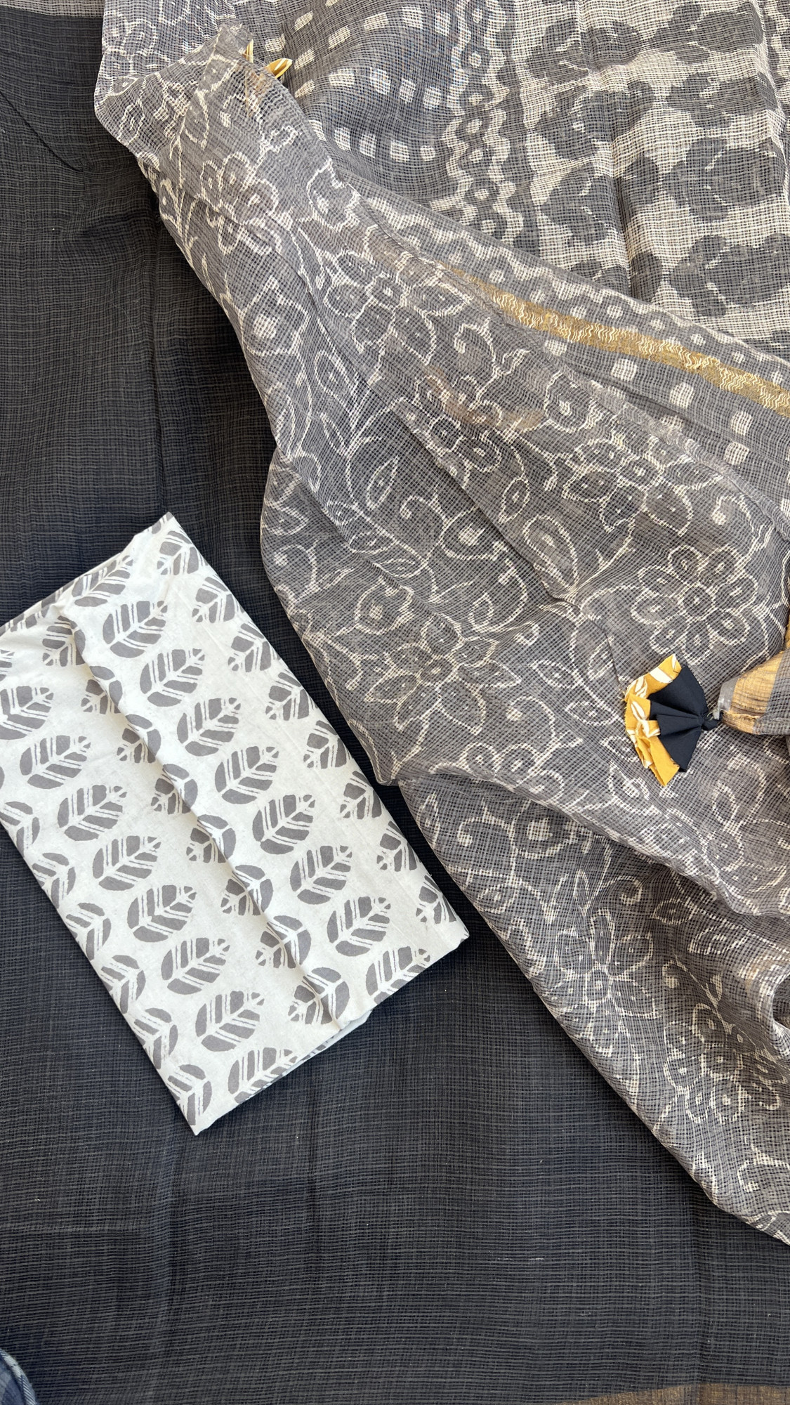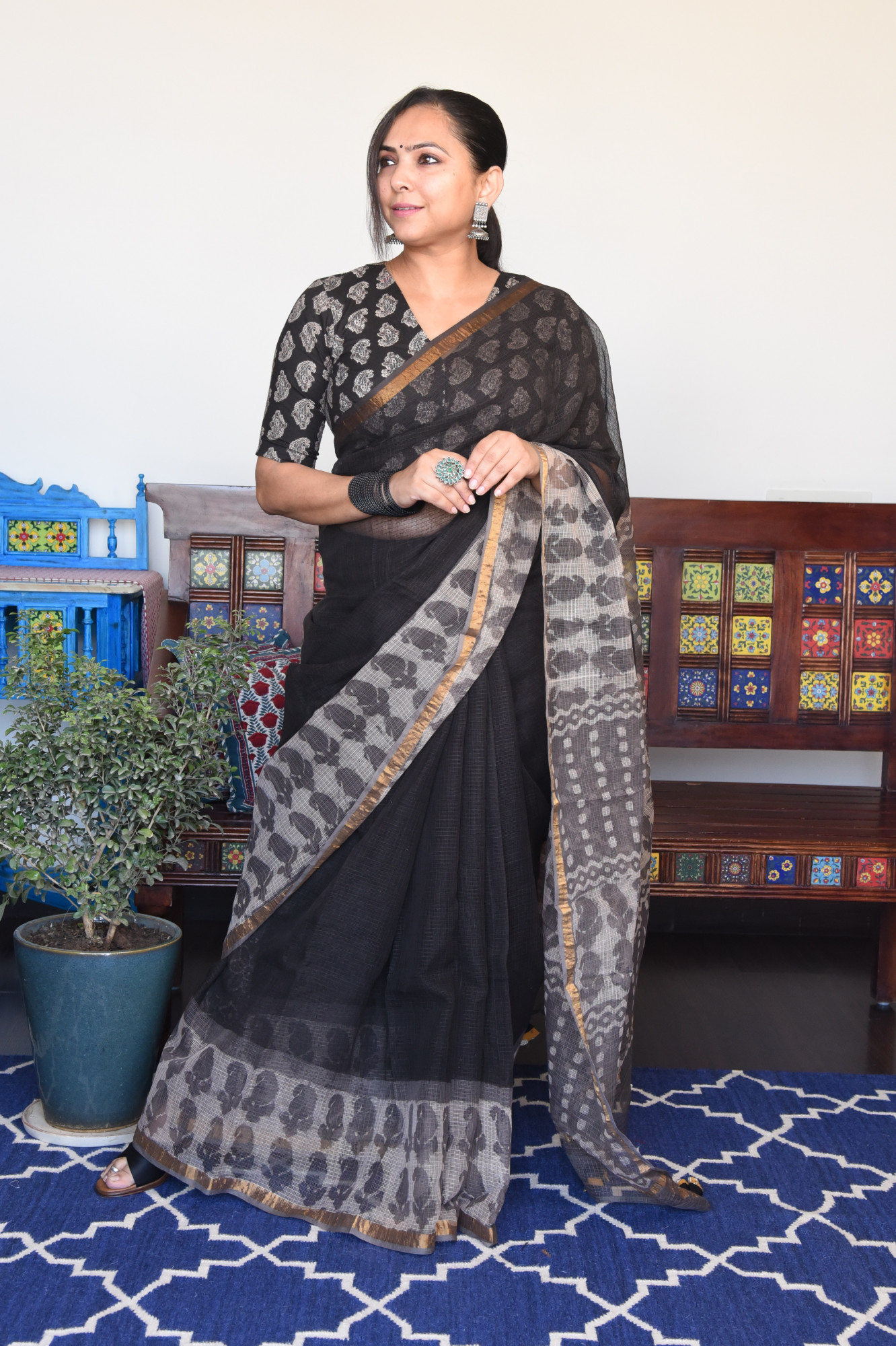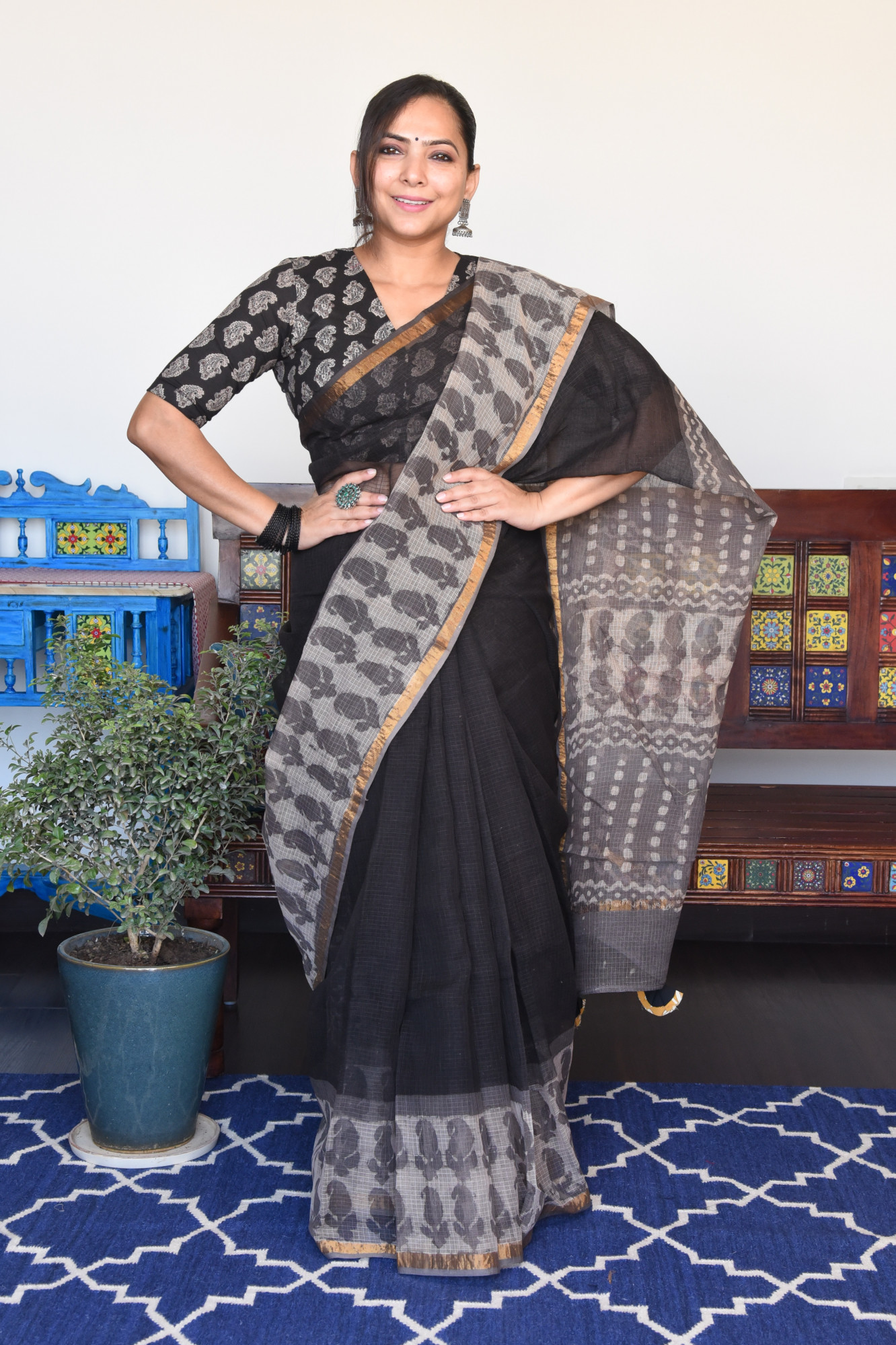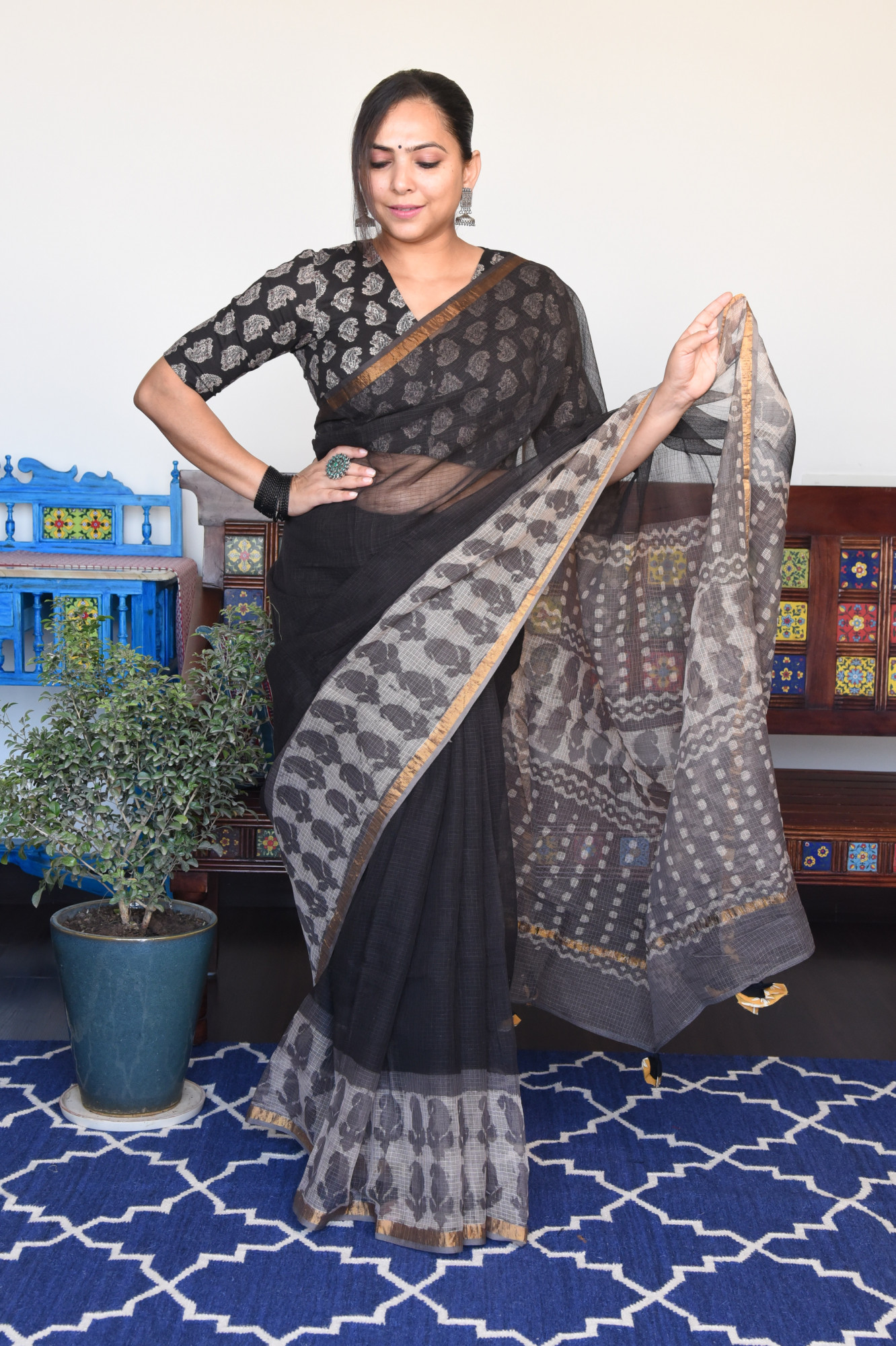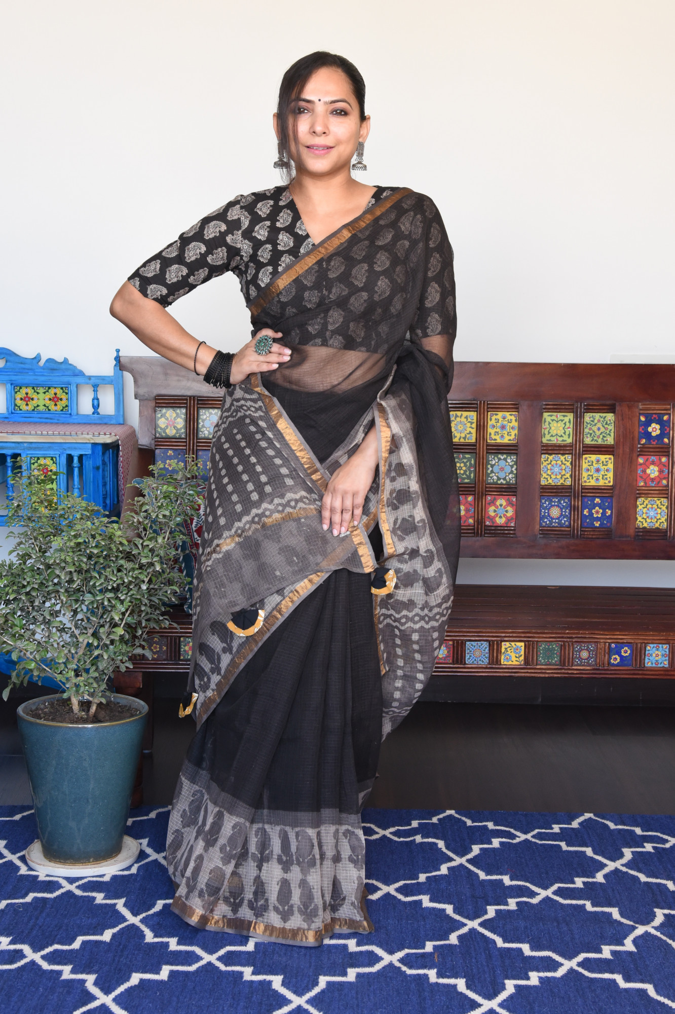 Handblock printed black grey kota doria cotton saree. Accessorised with fabric tassels.