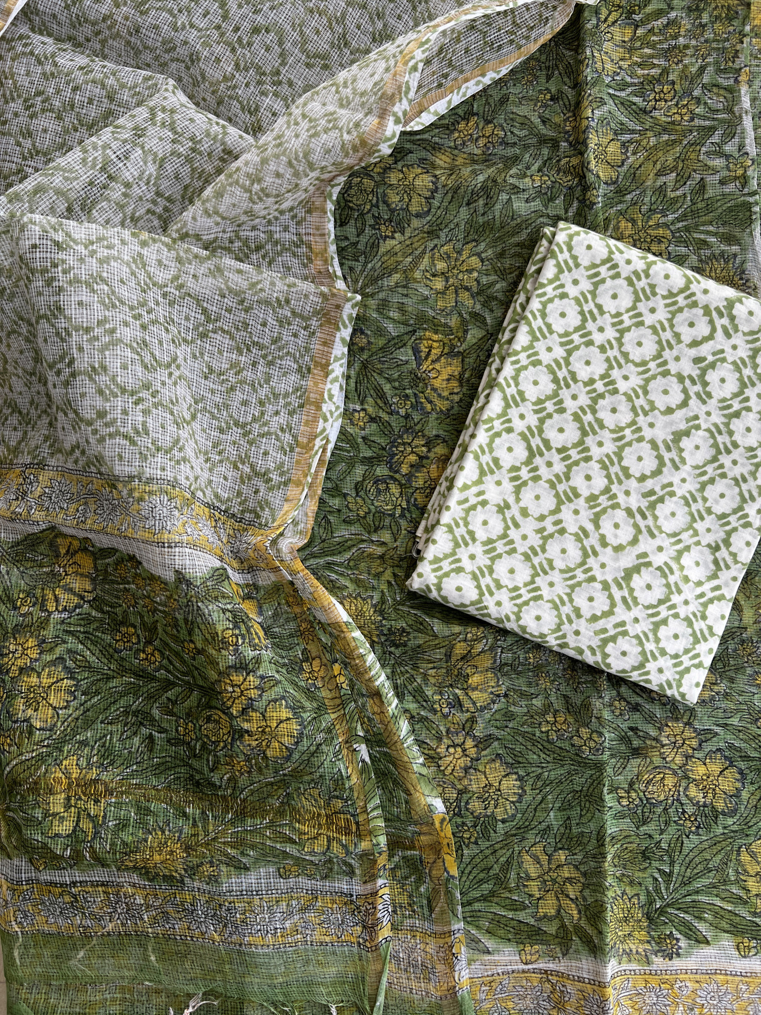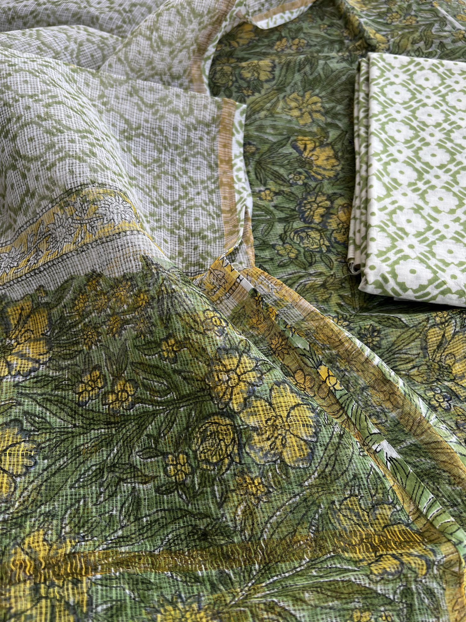 Handblock printed kota dupatta with gold zari comes with Kota kurta fabric and cotton bottom.