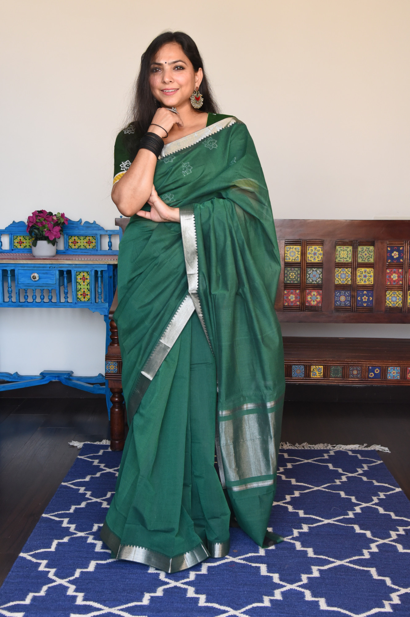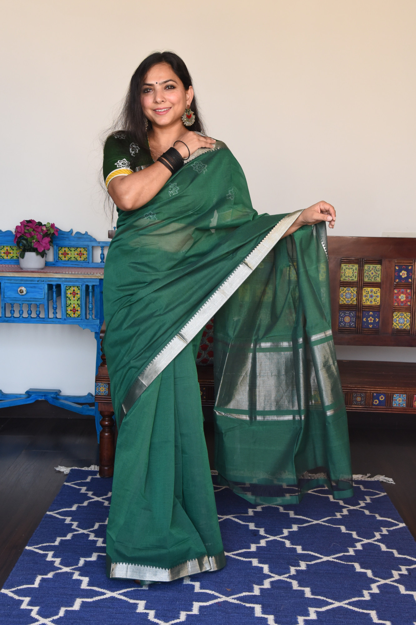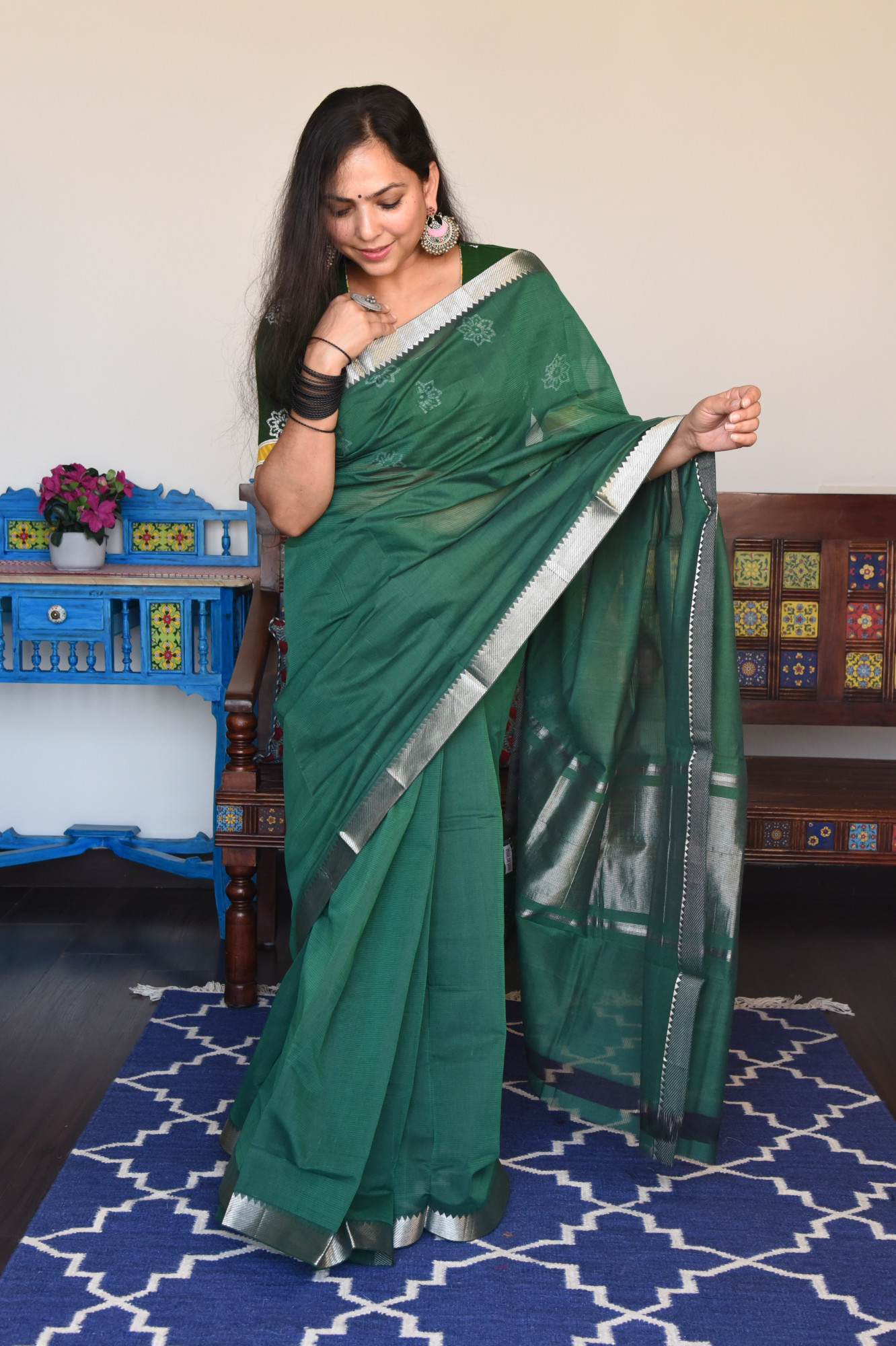 Mangalgiri missing weave cotton saree with silver zari nizam border and zari palla. Accessorised with self tassels.
