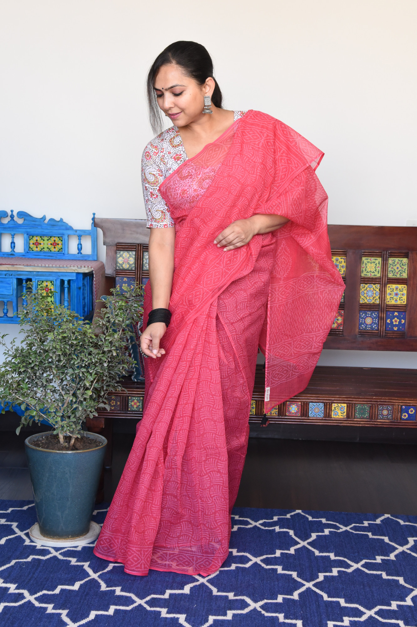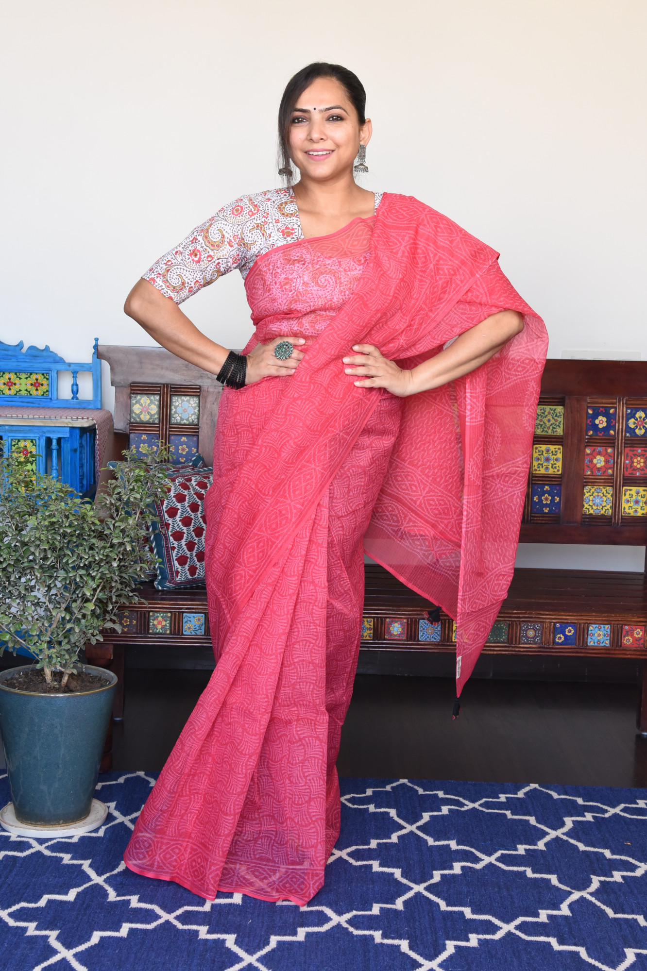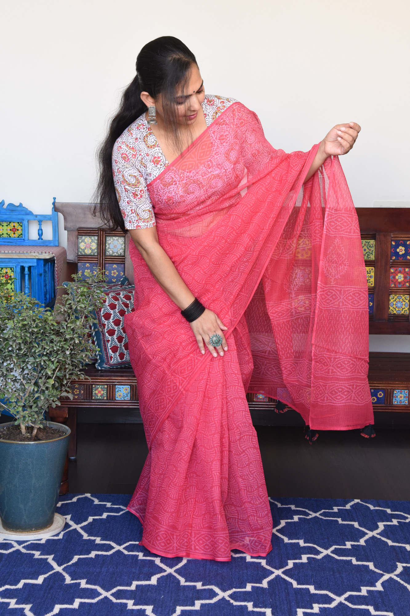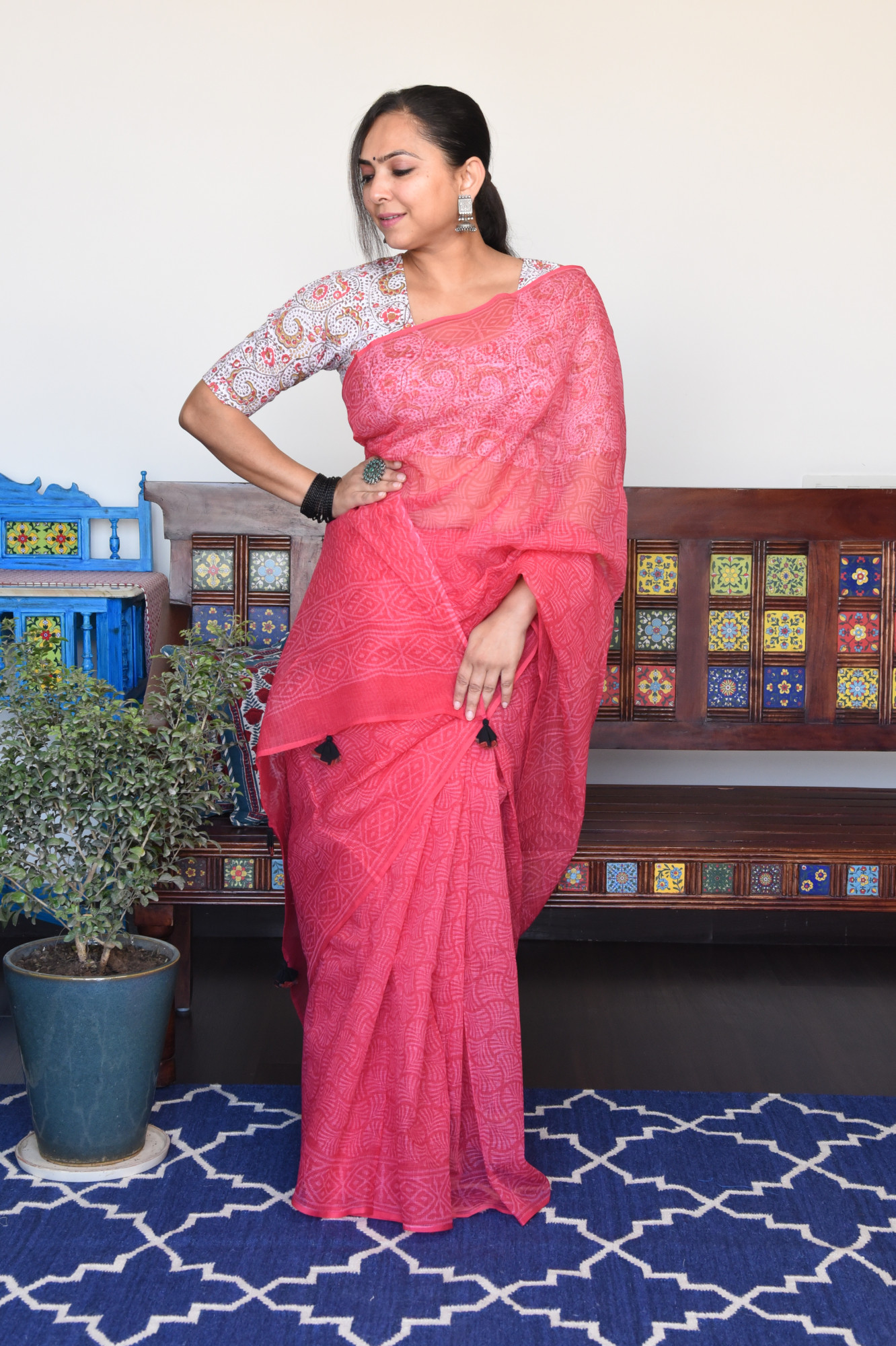 Handblock printed fuchia pink kota doria cotton saree. Accessorised with fabric tassels.
