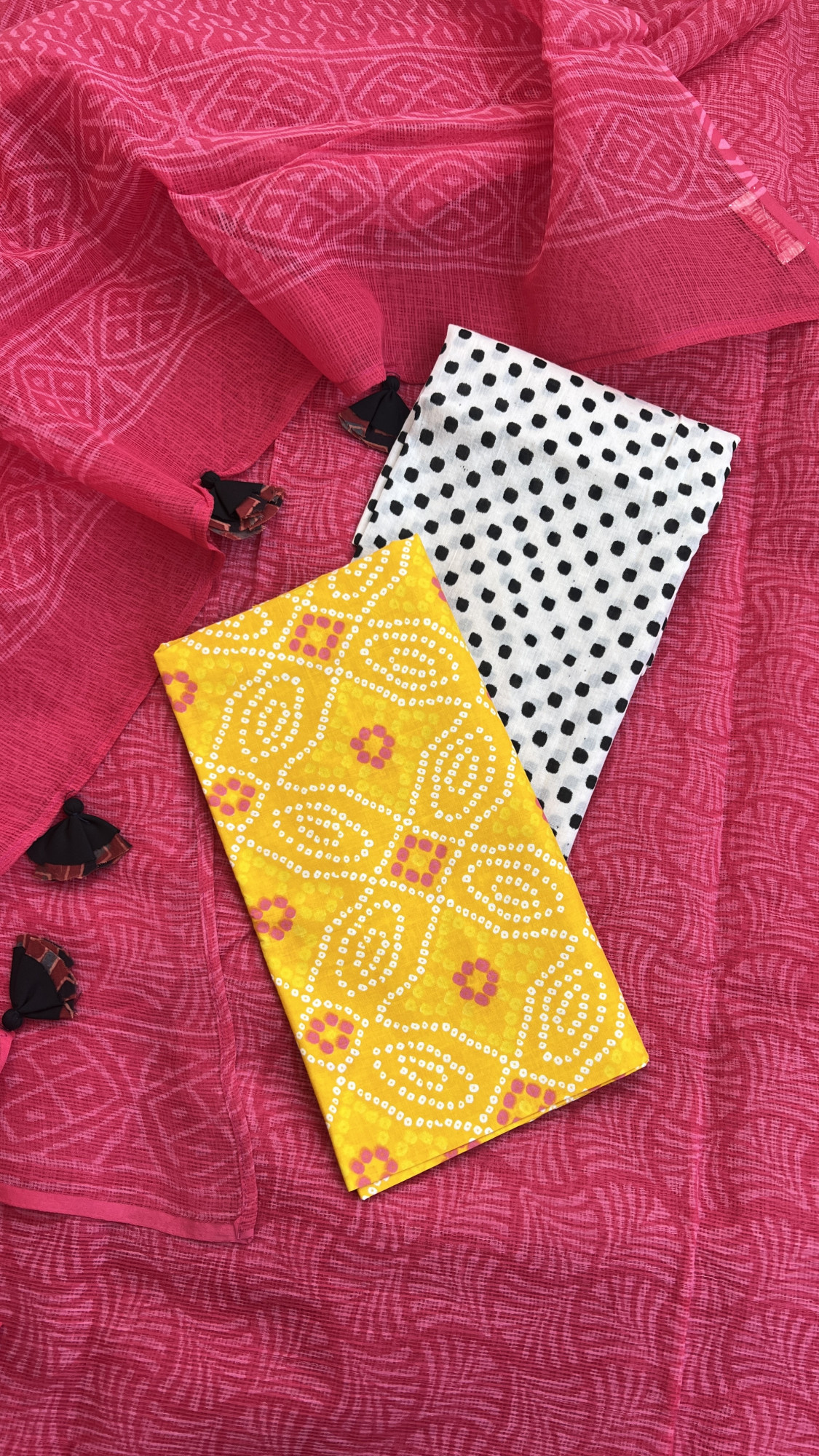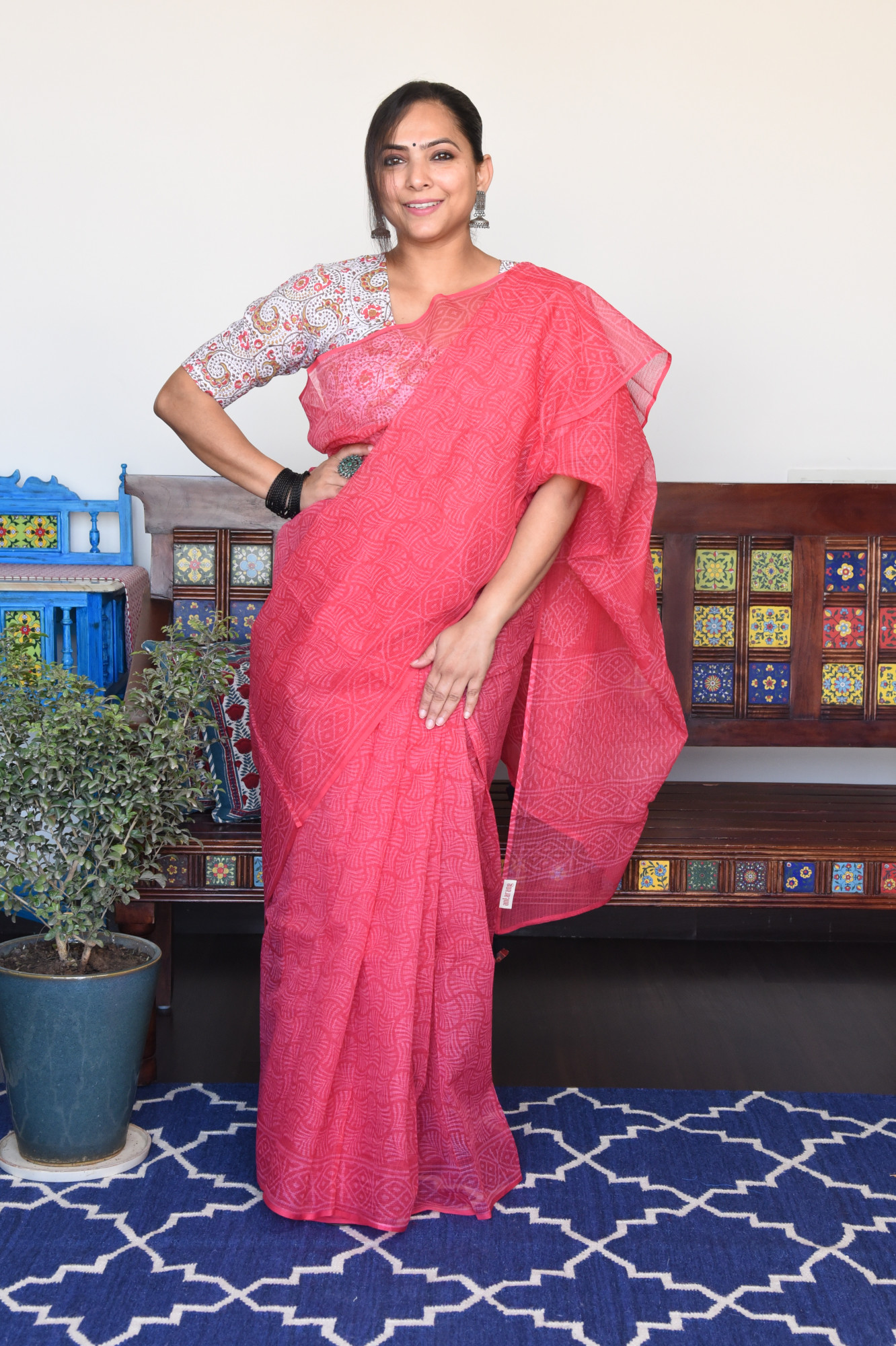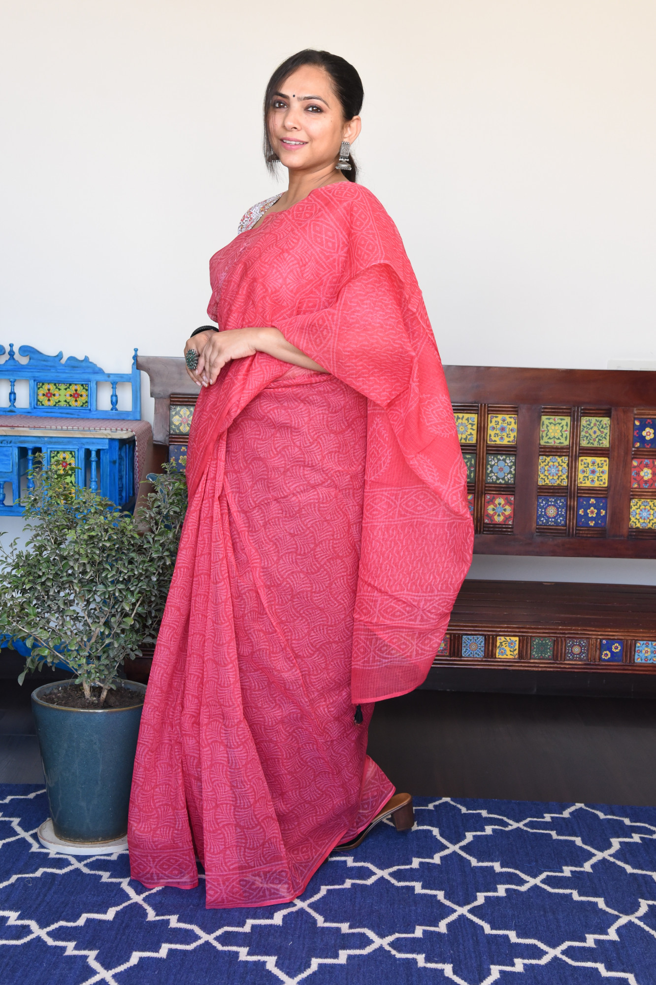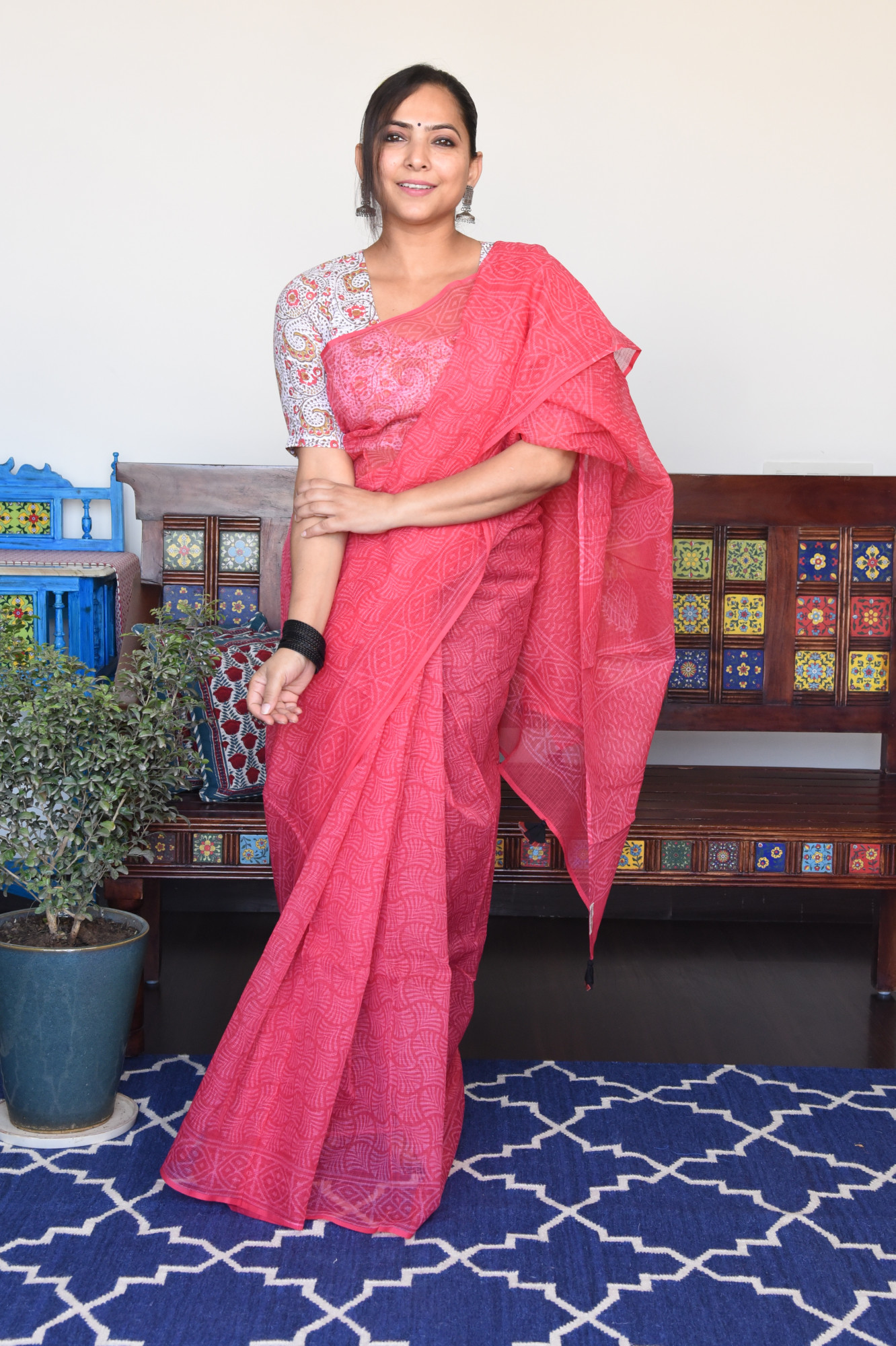 Handblock printed fuchia pink kota doria cotton saree. Accessorised with fabric tassels.